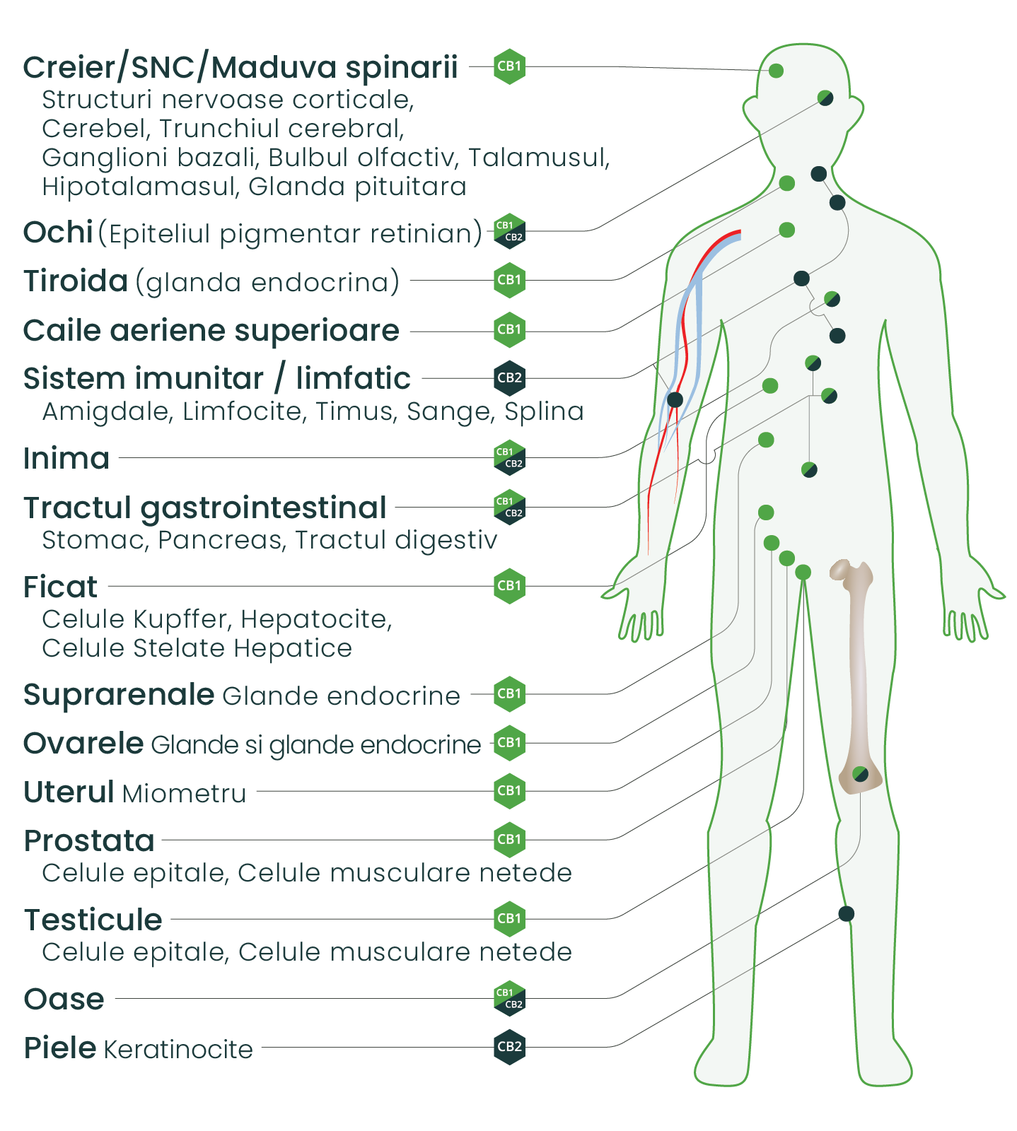 Key Point: CB1 receptors are most abundant in the brain and nervous system, while CB2 receptors are concentrated in immune cells. However, both receptor types appear throughout the body in overlapping distributions.