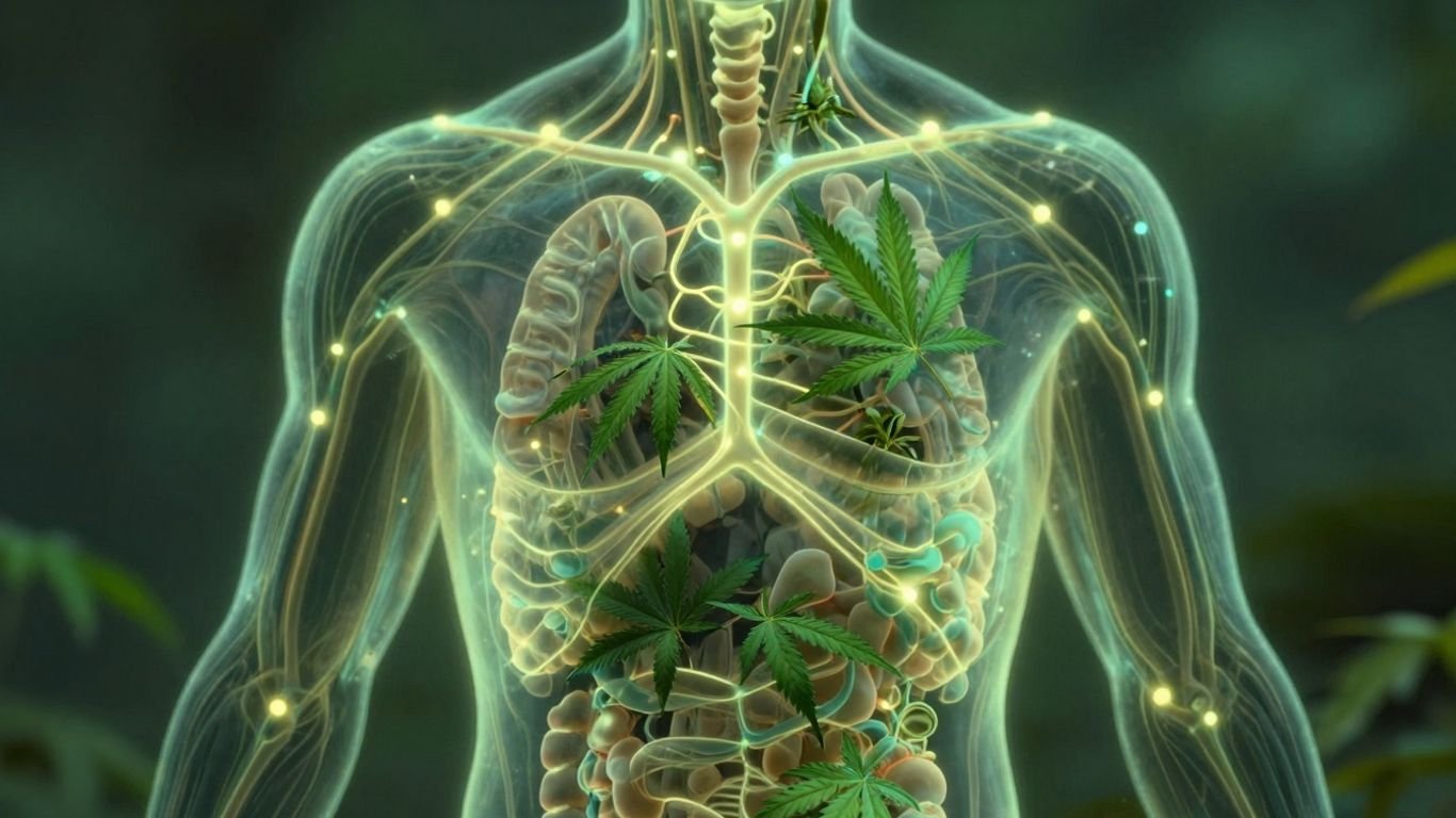 Internal body network with glowing pathways and cannabis leaf hints.